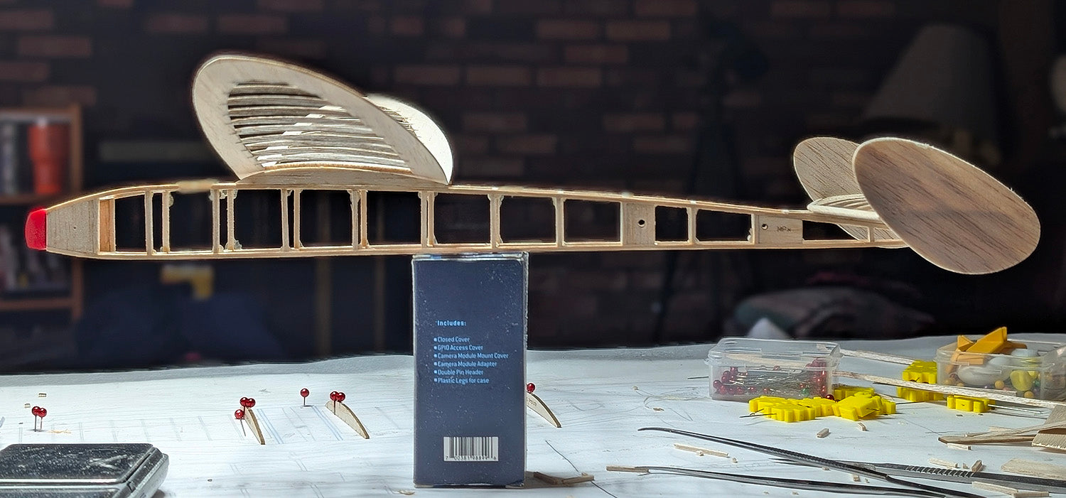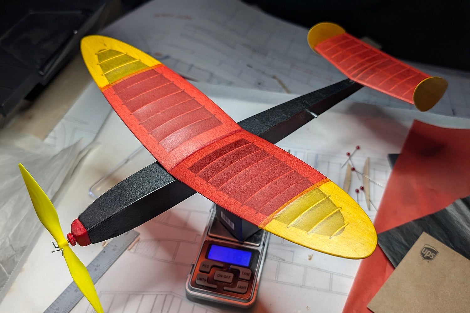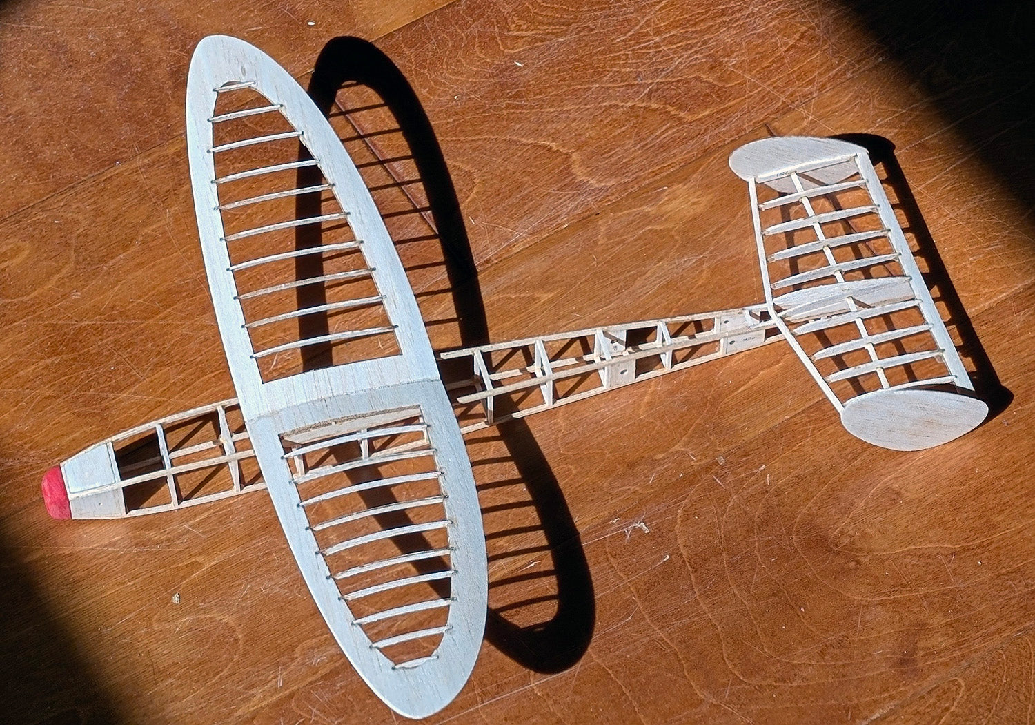A tiny OT Stick - just a 12.5" span! This is from the April 1950 Model Airplane news. I've had my eye on this for several years because I like small models. When the FAC extended "Old Timers" to the end of 1950, I just had to build this one. It went together quickly and features a Ritz-style wing - that is, a thin under camber, with fat Leading and Trailing Edges and no spars. You need to mold the wing panel to get the under camber before gluing in the ribs, but this is a simple process. Covering the wing with tissue makes a very strong wing.