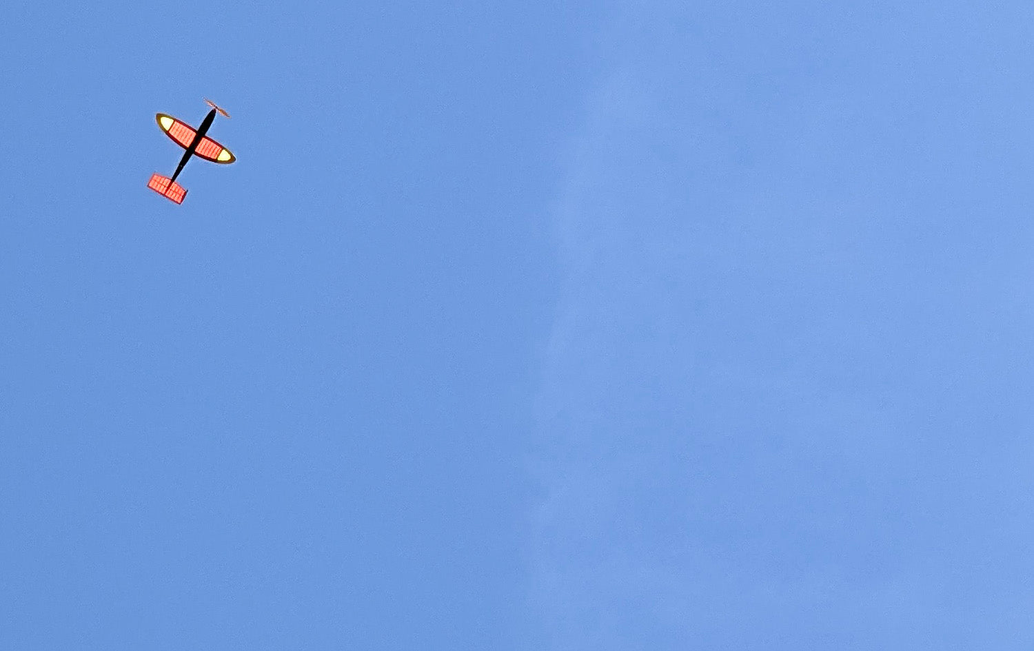 My prototype flew away into the woods on the first day out. I had it trimmed at home, but put some turns on it and away it went! I lost site of it across the road and behind some houses and into the woods at 1:50.