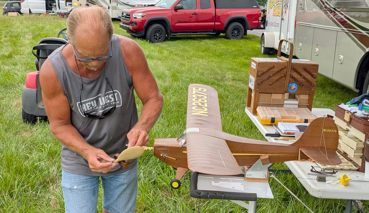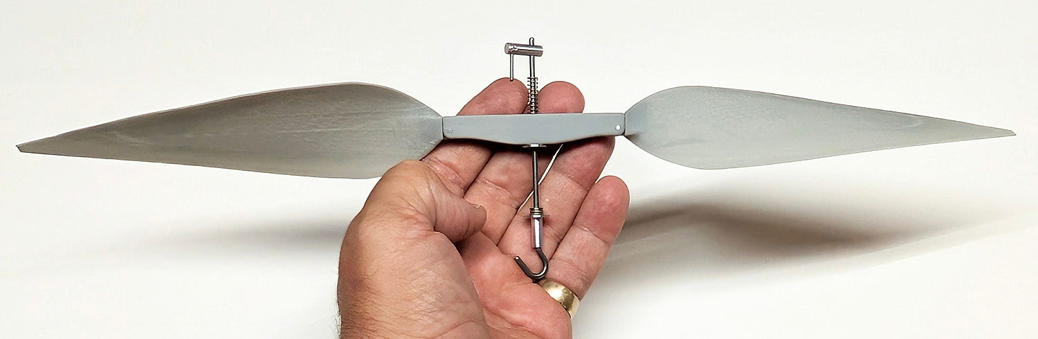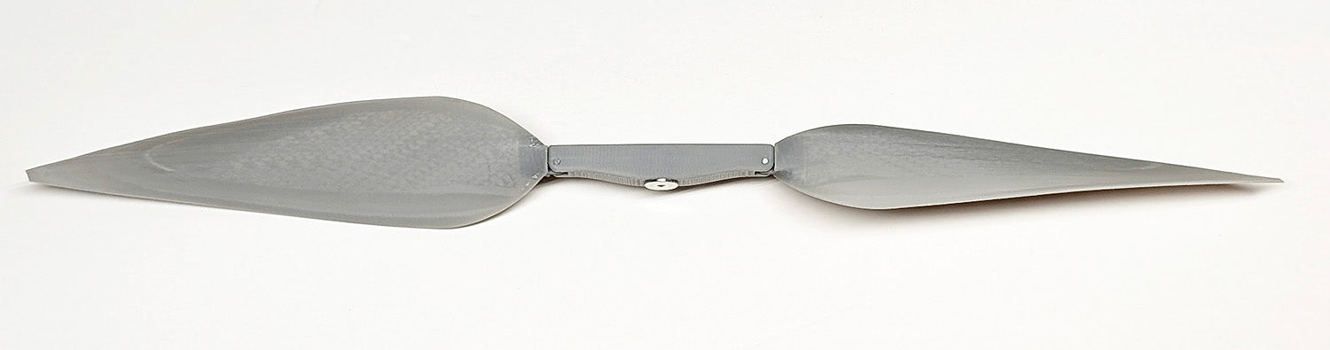 This is the prop that is on Winn Moore's model. It is a 16" diameter, 19" Pitch, with a 2" blade width (Larrabee blade profile) with a 3" diameter hub. This is what we call a "breakaway" prop: not designed to fold in flight, but to flex the blades on contact with the ground to avoid overstressing (and damaging) the prop and the airframe.