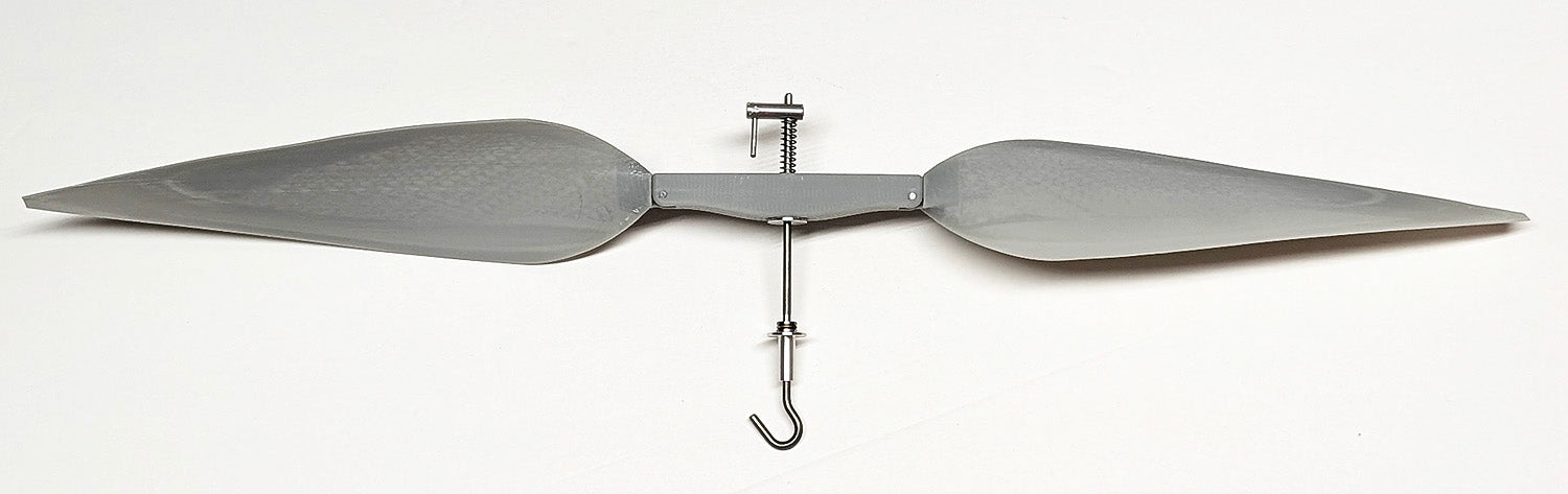 The propeller is printed in gray (only color) ABS and comes assembled with a Superior Props Aluminum Bushing for a 3/32" prop shaft. Another option is to include the Superior Props 3/32" Prop Shaft Assembly (prop shaft, nose button, ball bearing, spring, and drive dog). This propeller is not available separately.