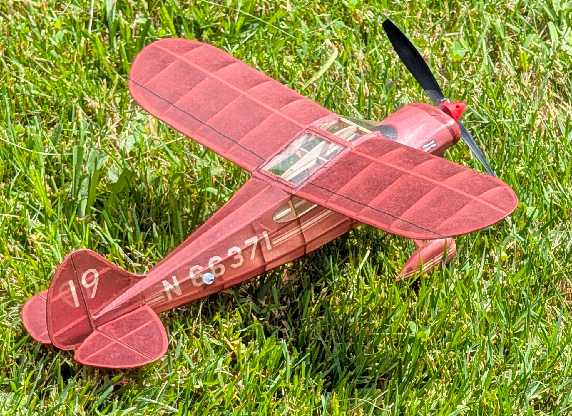 This is a PEANUT High Wing built using all 1/20" wood. Use light wood to keep the model light. My prototype came out at 12 grams, but could have been a gram or two lighter (heavy prop and nose button). Parts for built-up balsa wheels and wheel pants are included.