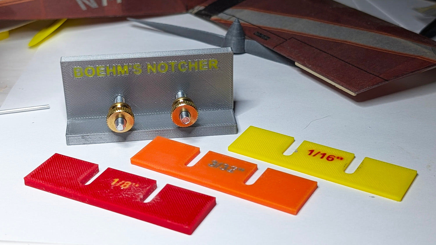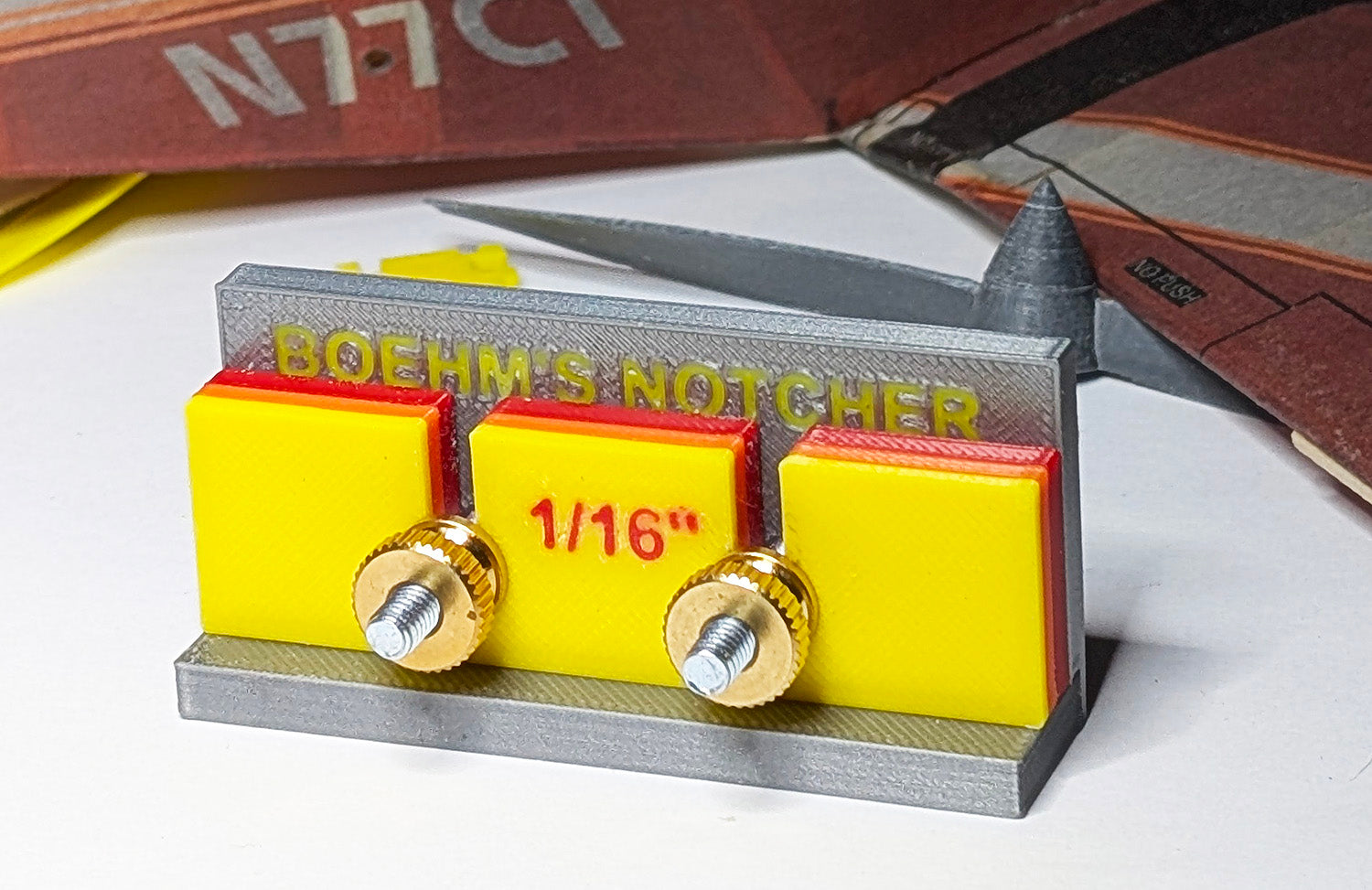 This is a reproduction of Chris Boehm's "Notcher". Chris has ceased production of the product and has given me permission to reproduce this useful tool as a 3D Printed item.